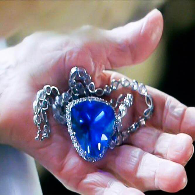 Following on from the success of Titanic, Asprey & Garrard were commissioned to make a real 170-carat heart-shaped necklace using Sri Lankan blue sapphire. This stone was encircled with 103 round white diamonds totally 30 carats, and hung on an 18-inch white diamond-studded chain.